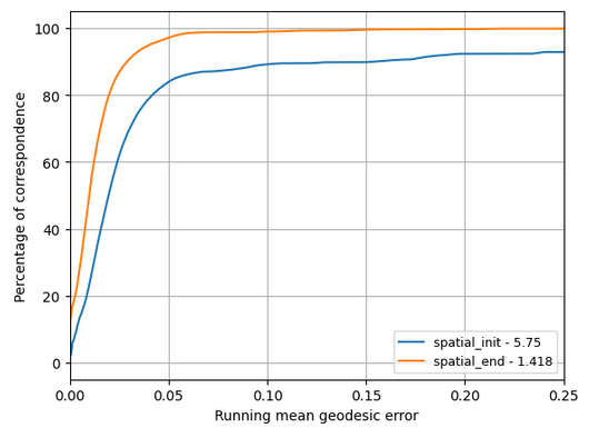 We add a new term to the loss we want to minimize. Given the transferred vertices \(X_{\mathcal{S} \to \mathcal{T}}\), we compute the point correspondance in the spatial coordinates (+normals, to avoid erros when parts are gluing to each other). We then extract a functional map based on this correspondance, \(C_{\text{spatial}}\), and minimize: