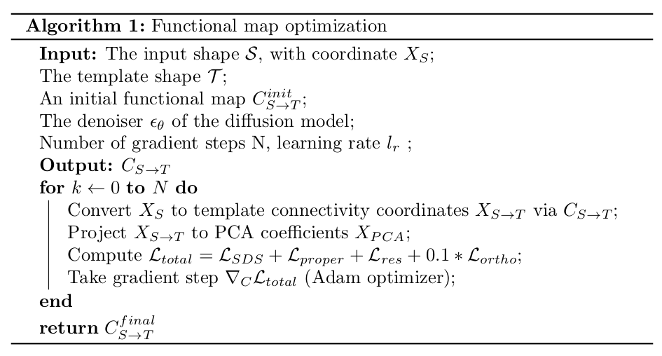 No. But if we add a new term to the loss we want to minimize. Given the transferred vertices \(X_{\mathcal{S} \to \mathcal{T}}\), we compute the point correspondance in the spatial coordinates (+normals, to avoid erros when parts are gluing to each other). We then extract a functional map based on this correspondance, \(C_{\text{spatial}}\), and minimize: