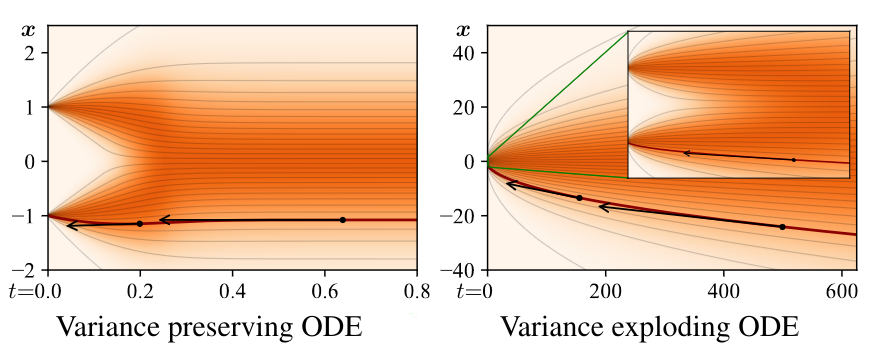 \(dx = \underbrace{f(x, t)dt}_{\text{"drift" term}} + \underbrace{g(t) dW_t}_{\text{"diffusion" term}}\),